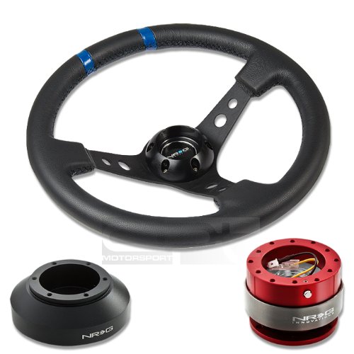 NRG-SRK-150H+016R-BK+200RD, NRG Innovations 13.78" 350mm 3" Deep Dish Style Black Leather Blue Center Marking Racing Steering Wheel Combo with 6 Hole Short Hub Adapter with Gen 2.0 Red Quick Release Kit SRK-150H